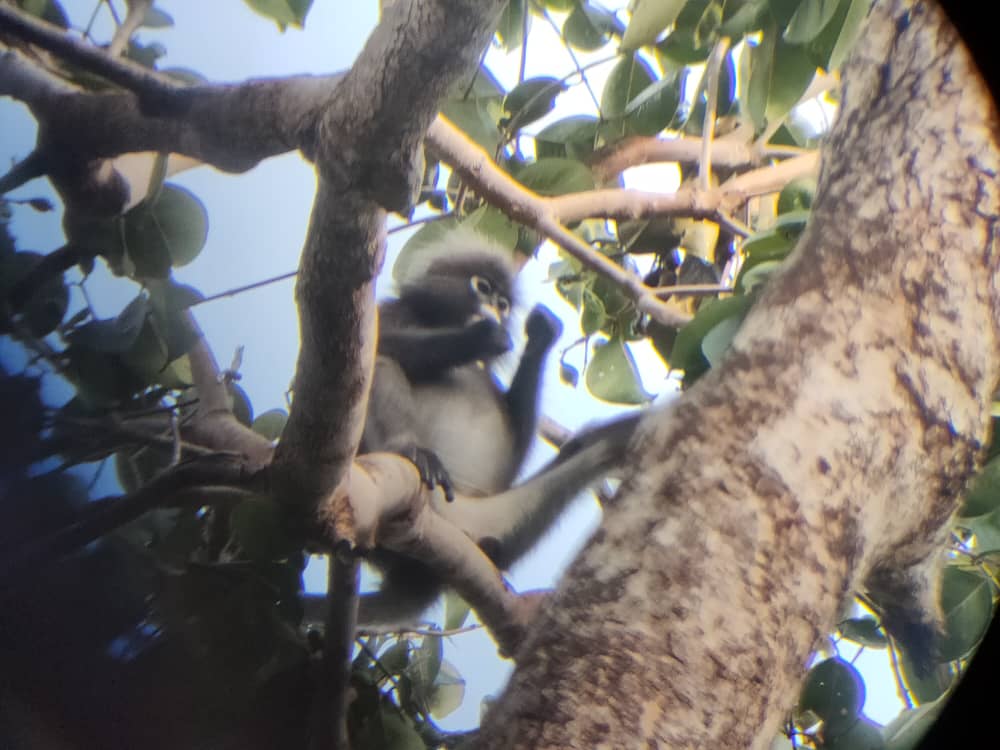 Chin up, eyes up. You see branches moving. You spot a dark silhouette of something against the grey sky. You grab your binoculars and point them towards the silhouette. You adjust the focus, and there it is! A Dusky Langur, sitting on a branch. Round spectacles, thick lips, nipples visible. Leng Lui.