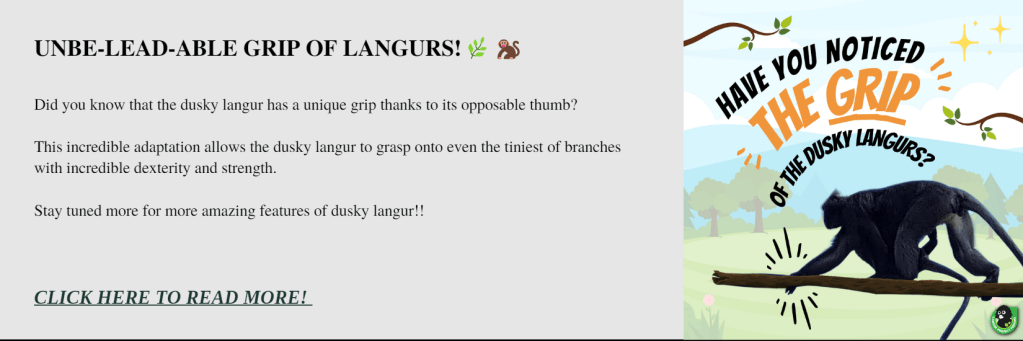 Dusky Newsletter – March 2023 Posted by Langur Project Penang on April 7, 2023 Share this: Click to share on X (Opens in new window) X Click to share on Facebook (Opens in new window) Facebook Like Loading... Related