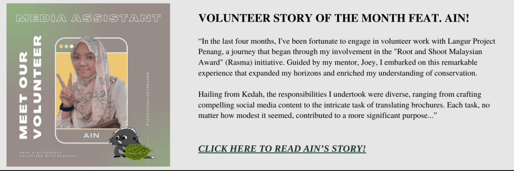 Dusky Newsletter – November & December 2023 Posted by Langur Project Penang on January 5, 2024 Share this: Click to share on X (Opens in new window) X Click to share on Facebook (Opens in new window) Facebook Like Loading... Related