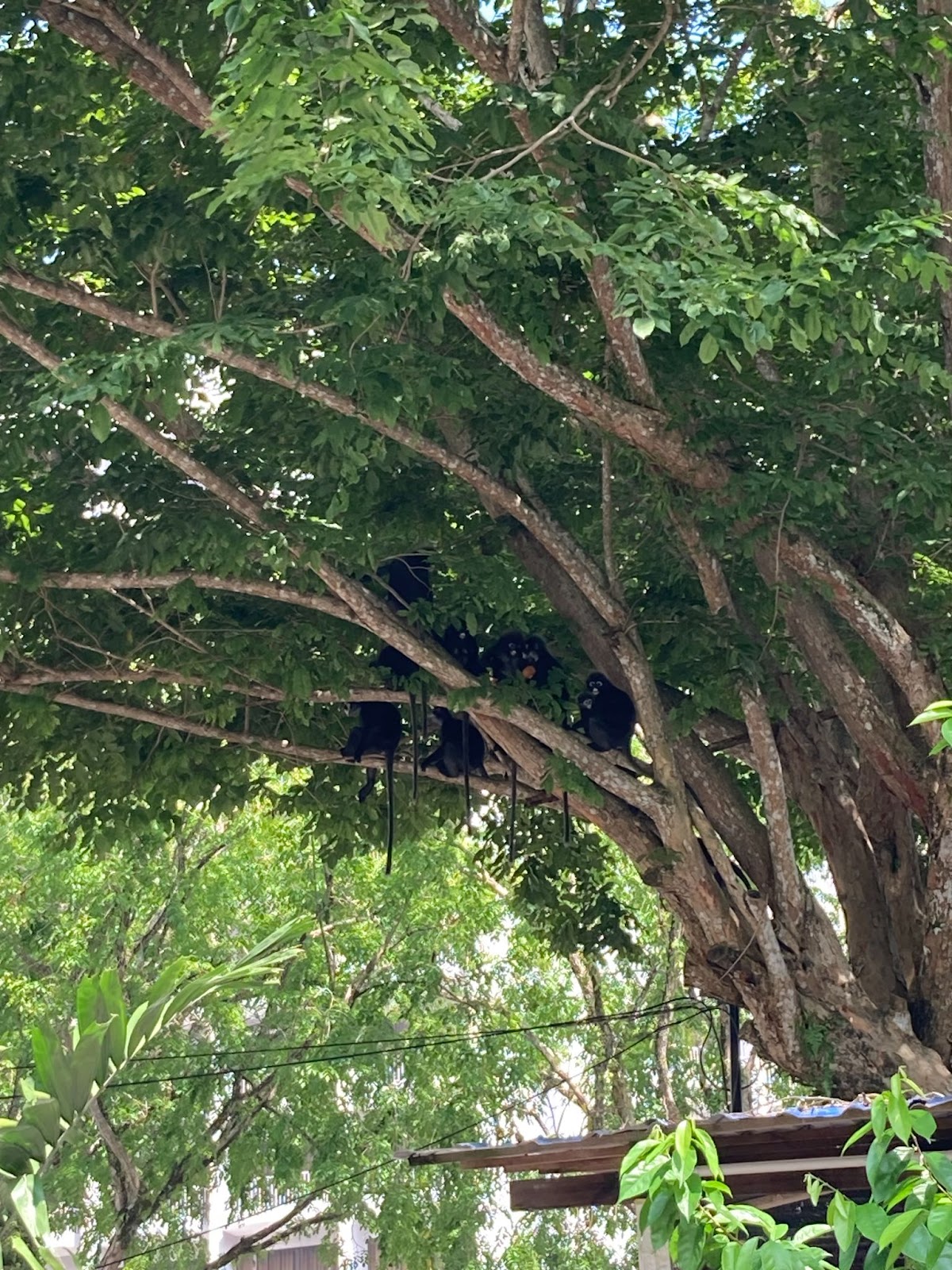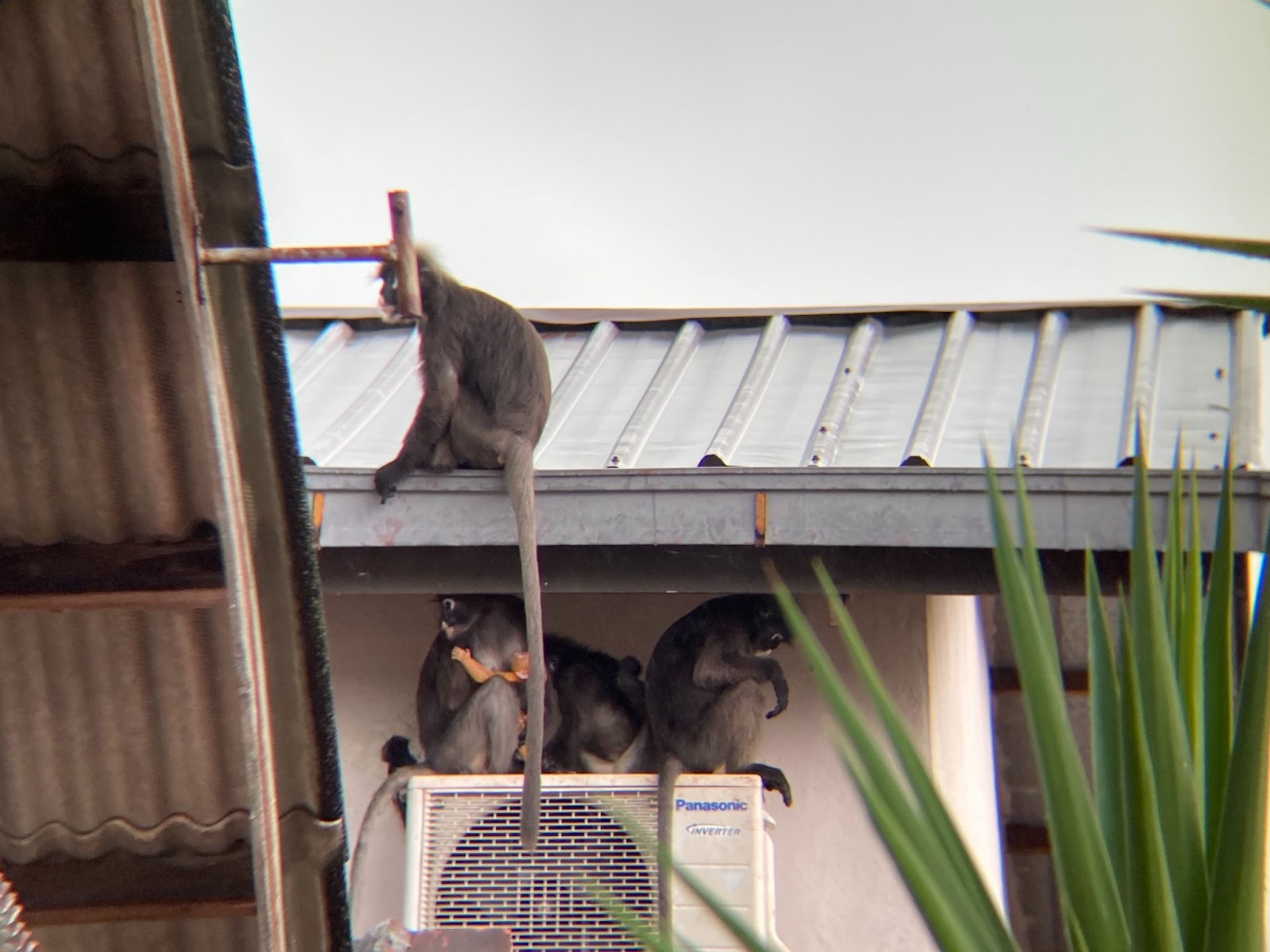 Photo on the bottom: The dusky langur troop, Ah Tan’s family, huddled on the air conditioner condenser under the roof, using it as shelter from the heavy rain in their fragmented habitat.