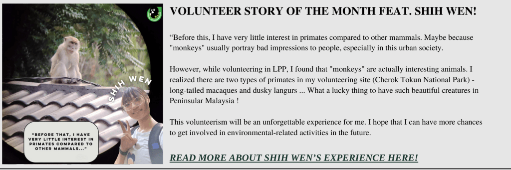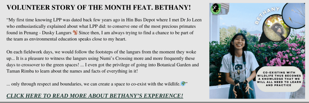 Dusky Newsletter – November 2024 Posted by Langur Project Penang on December 4, 2024 Share this: Click to share on X (Opens in new window) X Click to share on Facebook (Opens in new window) Facebook Like Loading... Related