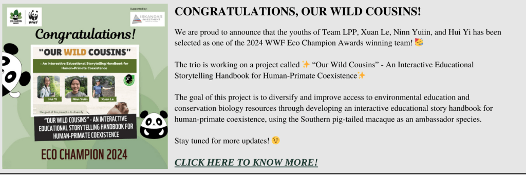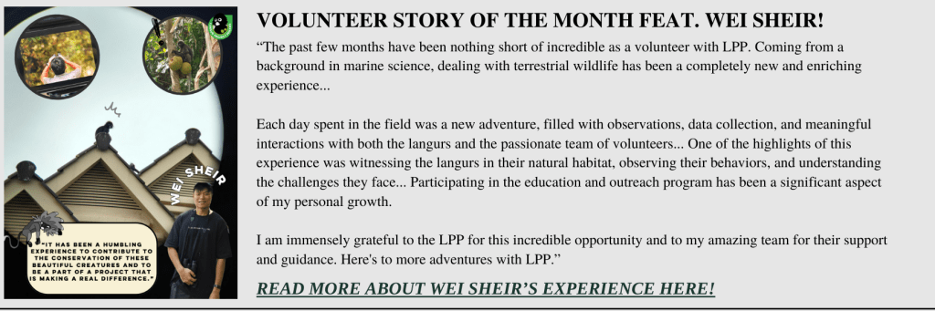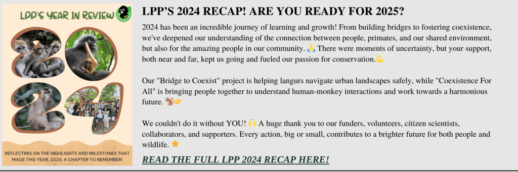 Dusky Newsletter – December 2024 Posted by Langur Project Penang on December 28, 2024 Share this: Click to share on X (Opens in new window) X Click to share on Facebook (Opens in new window) Facebook Like Loading... Related